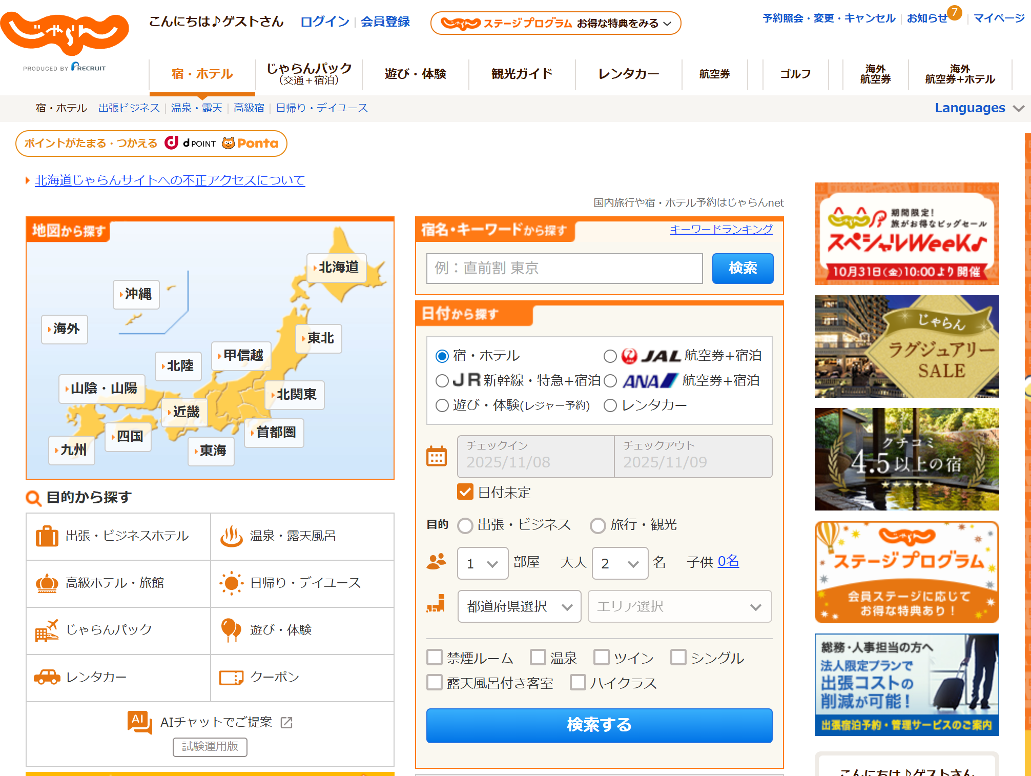 リクルートが運営する「じゃらんnet」は、温泉・宿泊特化型の旅行予約サイト。